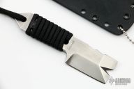 This Micro Bug Out Blade by Peter Atwood has a V-notch prybar and a chisel ground blade, paracord wrap. Excellent condition. Comes with a kydex sheath with ball chain and original card. Excellent condition.