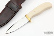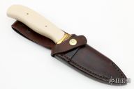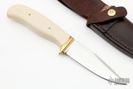 This knife by Jeff Hebeisen features a mirror polished blade with .178" blade stock and 1.050" blade depth, hidden tang construction. The handle has a brass guard and ivory paper micarta grip with brass pins. Comes with a brown leather sheath. Excellent condition.