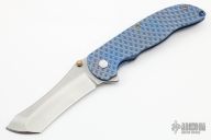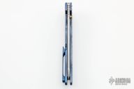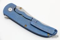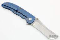 This Norseman (#2012) by John Grimsmo features a tumble finished blade with a single anodized titanium thumb stud, notched thumb ramp and flipper. Tumble finished and anodized titanium frame with a textured front scale and anodized titanium screws. Very smooth action that requires no wrist movement. Nice detent, lockup and blade seating. Rides on ceramic bearings. Knife is in excellent condition, shows no signs of use or carry. Comes with original packaging, custom hard case, Nano-Oil, tool, and COA dated March 1st, 2019.
