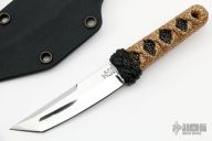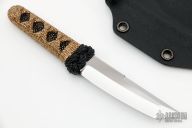 This Mini Tanto Neck Knife by Sam Eddleman features a mirror polished tanto blade with false top edge, .159" blade stock and .728" blade depth. Handle is wrapped in a traditional Japanese style using epoxy soaked nylon cord over rayskin. Knife is in excellent condition, shows no signs of use. Comes in a custom black kydex neck sheath.