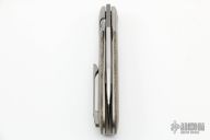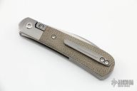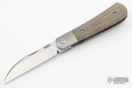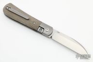 This Swayback Front Flipper by Enrique Pena features a satin finished blade with a front flipper and notched thumbrest. The handle has titanium bolsters, green canvas micarta scales with a titanium backspacer and matching tip up pocket clip. Includes a Pena X-Series padded box. Excellent condition.