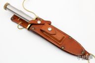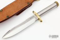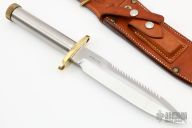 This Model 18-7.5 Attack Survival from Randall Made Knives has a spear point blade with sharpened top edge and sawteeth, .239" blade stock and 1.370" blade depth, hidden tang construction. The handle has a brass guard and knurled butt cap, stainless steel handle. Comes with a brown leather Johnson Rough Back stitched and riveted sheath with a SP-13 Norton Bear Brand white sharpening stone. Has gold para cords. Excellent condition.  Comes with a zippered case. Made in 1970-71. Has "GERALD FOX" on the back side of the blade.