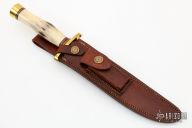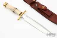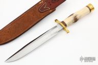 "The Model 1 by Randall Made Knives was made famous by Allied combat troops in World War II and has since been widely used in all theaters of war." This knife features a satin finished blade with a sharpened top edge, .238" blade stock and 1.183" blade depth, hidden tang construction. The handle has a lugged brass guard, stag grip with red/white/blue spacers, and brass butt cap with brass nut. Includes its original HH Heiser Brown Button brown leather sheath with two-tone gray Crystolon combination sharpening stone, and a zippered case. This knife is from the  1958-1960 and is in spectacular condition, but does have one little stain on the front side of the blade, otherwise excellent condition. "ROY KAWAJA" on the back of the blade.