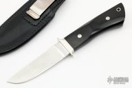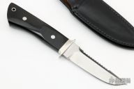 This Argonaut/Natchez AD681 by Benchmark Knives features a satin finished blade with serrated top edge, .177" blade stock and 1.042" blade depth, full tang construction. The handle has a nickel silver guard, black linen micarta, thong hole. Comes with a black leather sheath with boot/belt clip. Comes with original box and papers. Excellent condition.