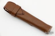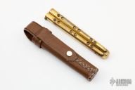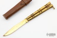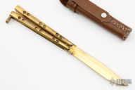 This balisong from the Philippines features a mirror polished brass blade with a false top edge. The handle has brass scales and brass channel construction, brass T-latch with green and purple inlays. totally non-magnetic. Has scratches and patina, but that is normal for these. Excellent condition. Comes with original brown leather sheath.