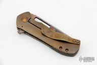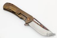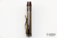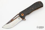 This Recon Flipper by Doc Shiffer features a two-tone finished Magnacut blade with thumbhole, flipper and fileworked thumbrest. The handle has a copper carbon fiber scales and backspacer, anodized titanium liner and frame, anodized titanium pivot with a copper pivot collar, and an anodized titanium tip up clip. Rides on bearings, nice detent, lockup and blade seating. Comes with a COA dated 5-20-22. New from maker.