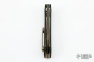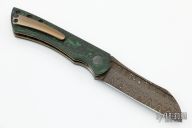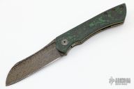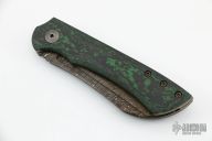 This One Off Valkyrie is a Collaboration between Doc and Michael Shiffer. It features a Chad Nichols Damascus with fullers and notched thumbrest. The handle has black/green Fat Carbon scales, anodized titanium liners, backspacer and tip up clip. Rides on bearings, nice detent, lockup and blade seating. Comes with COA dated 5-15-22. New from maker!