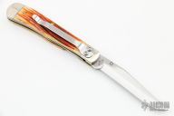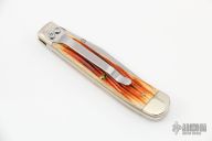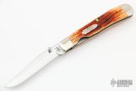 This TrapperLock 5154LC from Case Knives features a polished clip point blade with single thumbstud. The handle is comprised of nickel silver bolsters and pommel and sunset jigged bone scales over brass liners and stainless steel liner lock. Stainless steel tip down clip and backspacer. Includes original box and paperwork. Excellent condition.