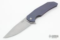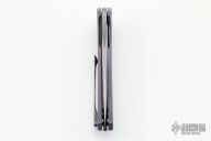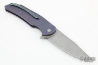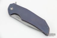This Dragonfly Flipper by Herman Knives features a tumbled clip point blade with flipper and laser textured thumbrest. The handle has a milled an anodized titanium frame, titanium liner, and tip up titanium clip and a floating timascus backspacer. Nice detent, lockup and blade seating. Rides on bearings. Excellent condition. Comes with original case.