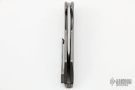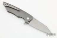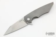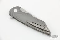 This Vespertilio Flipper by Herman Knives features a tumbled blade with flipper. The handle has a milled titanium frame, titanium liner, and tip up titanium clip and backspacer. Nice detent, lockup and blade seating. Rides on bearings. Excellent condition. Comes with zippered case, original box and COA dated 5-4-22.