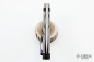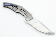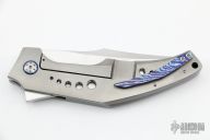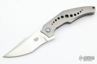 This SOS by Tashi Bharucha features a hand rub satin finished blade with flipper. The handle has a bead blasted titanium frame with a MokuTi tip up clip. MokuTi pivot collars and a zirconium backspacer. Rides on bearings, nice detent, lockup and blade seating. Comes with zippered case. New condition.
