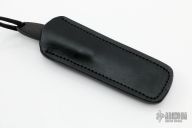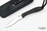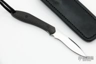This Mongoose by Jerry Moen features a mirror polished recurve blade with notched thumbrest, .100" blade stock and .554" blade depth, mortise tang construction. The handle has a honeycomb milled carbon fiber grip with lanyard hole. Comes with a black leather sheath with pocket clip. New from Maker.