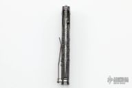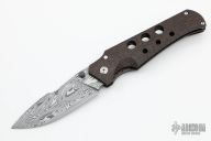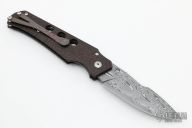 This Scout from Jason Guthrie features a Thor Damasteel pattern blade with single thumb stud and notched thumbrest. The handle is comprised of side cut copper carbon fiber, titanium inlaid lockbar, barrel spacers, and anodized titanium tip up pocket clip. Comes with zipper case, and COA dated July 2022. New from Maker.