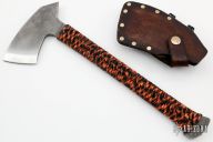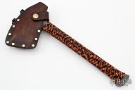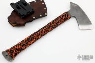 "The Cure" by Frank Landau features a hand forged head with a spike at the rear, forged finished flats, .226" blade stock, full tang construction with paracord wrapped handle. Comes with a brown leather sheath with TekLok. Excellent condition.