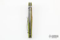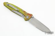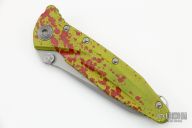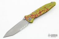 This Socom Delta T/E by Microtech Knives features a bead blasted partially serrated tanto blade with swedge , dual thumb studs and notched thumbrest. The handle is comprised of toxic green anodized machined aluminum with custom random blood spatter pattern with a titanium lockbar over a titanium backspacer with lanyard bail. The black titanium pocket clip is positioned for tip up carry. Dated 2013 in the bio-hazard logo and #0024. Excellent condition. Comes with a zippered case.