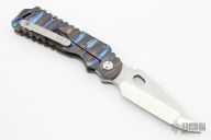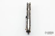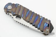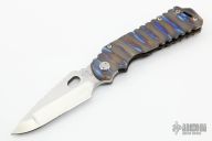 This Arktika from Medford Knife & Tool features a satin finished compound ground blade with notched thumbrest and spine, thumbhole opening, 1/4" blade stock. The handle has a textured and anodized titanium frame, D2 skull crusher and backspacer, and a tip up titanium clip. Comes with original box and papers. Excellent condition.