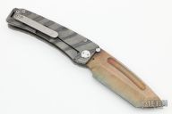 This Marauder by Medford Knives features a vucan finished tanto blade with fullers. The handle has a tumbled and flamed titanium frame with a D2 skull crusher at the butt and tip up tumbled titanium clip. Nice detent, lockup and blade seating. Comes with original box and papers. Excellent condition.