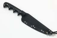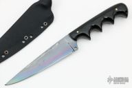 This Military Stiletto by Fred Perrin features a blued blade with notched thumbrest, .152" blade stock and 1.264" blade depth. The handle is comprised of black linen micarta scales with nickel silver pins over full tang construction. Includes kydex sheath. Has a few light scratches, otherwise excellent condition.