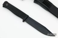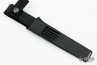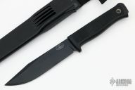 This Model S1 Forrest Knife features a Laminated 420 and VG10 Core with a black coating, .196" blade stock and 1.130" blade depth. Hidden tang construction. Zytel handle with the end of the tang protruding through the butt. Comes with a black molded plastic sheath. Has some light scuffs, otherwise excellent condition.