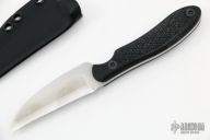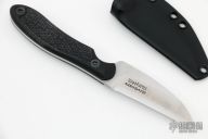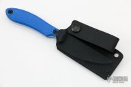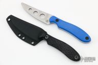This Disciple from Bantang Knives and Shivworks features a satin finish blade with .126" blade stock and 1.079" blade depth, full tang construction. The handle is comprised of textured black G-10 scales. Comes with a kydex sheath. Has a couple light scratches, otherwise excellent condition. Comes with matching trainer in blue G-10 that has its own sheath.