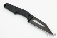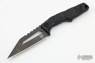 This Stark V2 by Bawidamann Blades features black cerakote finish on the blade, has notched thumbrest, .104" blade stock and 1.029" blade depth, full tang construction. The handle has IM Bawidamann Chunked Pattern Carbon Fiber scales (proprietary Carbon fiber composite). Comes ready to carry with the Bawidamann Uberscabbard. Has a couple light scuffs, otherwise excellent condition.