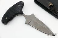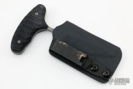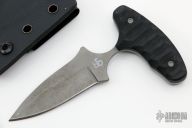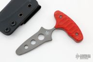 This Push Dagger by ShivWorks has a bead blast blade with a false top edge and black G10 handle, full tang construction, blade thickness of .181" and depth of 1.228". Kydex sheath. Has some oxidation on the blade and a few light scratches, otherwise good useer condition. Comes with matching trainer with red scales and a kydex sheath.