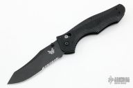 This Contego from Benchmade features a black partially serrated blade. Black G-10 handle textured in the center and grooved on edges for a better grip. Carbide glass breaker on pommel. Perfect function and strong lock up. Excellent Condition. Discontinued.