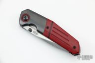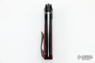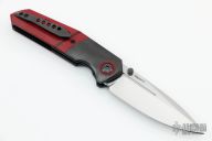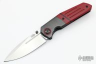 This Pocket Rocket R by Shane Sibert features a hand rub satin finished Magnacut blade with notched thumbrest and dual zirconium thumbstuds. The handle is comprised of dovetailed zirconium bolsters with red linen micarta pivot collars, red linen micarta scales with black stripes, black coated titanium liners, red linen micarta backspacer, zirconium pivot and tip up clip. Nice action and detent. Comes with zippered case and COA dated 05/2022 and zipper case. Excellent condition.