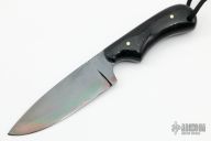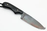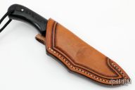 This Drop Point by Fred Perrin features a black blade with notched thumbrest, visible temper line, .145" blade stock and 1.193" blade depth, full tang construction. The handle is comprised of contoured black linen micarta scales with nickel silver pins and lanyard hole. Includes a brown leather sheath, its for a different knife, but fits nicely. Has a few light scratches, otherwise excellent condition.