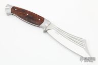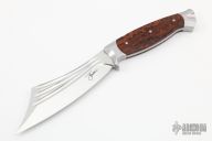 This Cerberus by Javan Roberts features a hand rub satin finished blade with fullers and false top edge, .175" blade stock and 1.685" blade depth, full tang construction. The handle has satin finished 416 stainless steel bolsters and pins with beautiful ironwood burl scales. The spine of the tang has been laser engraved. Comes with a zippered case and COA #007. New from maker.