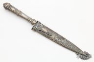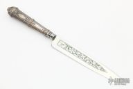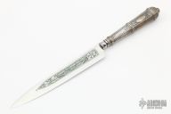 This Boot Knife by Abramo Eberle & Co features a mirror polished blade with "Standard Oil Company (New Jersey) 1954 - Press Dinner" on the front and similar etching on the otherside, .069" blade stock and .577" blade depth, hidden tang construction. The handle is .800 silver along with the scabbard. Comes with original presentation box, box has some wear. Has some patina on the silver, otherwise excellent condition.