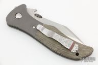 This Po-Boy Emerson Seax by Andrew Charlet features a satin finished blade with notched thumbrest, oversized thumbdisc and wave feature. The handle has dovetailed bead blast finished titanium bolsters and liners, green canvas micarta scales, and tip up laser engraved stainless steel clip. Comes with original box, black G-10 scales and black screws. Has a few light scuffs, otherwise excellent condition.