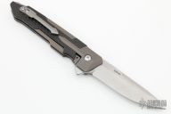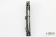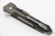 The Handle: The handle is a long, ergonomic, "Kwaiken-like" profile built from solid titanium with 3D machined horizontal texture on the outside and herringbone on the inside. Both titanium slabs are inlaid with smooth, black G10 in the "Spartan Helmet" design. Lock operation is solid and smooth and over travel prevention through the clever use of the inlay. A small titanium backspacer offers a generous lanyard loop attachment.