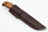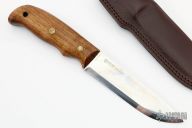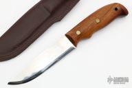 This Didi Galgalu by Helle features a hand rub satin finished scandi ground laminated steel blade with .104" blade stock and 1.219" blade depth, full tang construction. The handle has South African Kilat wood scales with red liners and brass pins. Comes with original brown leather sheath. Has some light scratches, otherwise excellent condition.
