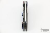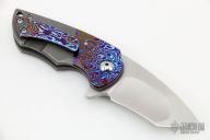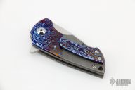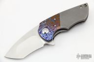 This dressy Brute flipper by Christensen Knifeworks features a satin finished blade with flipper. The handle is tumbled titanium with timascus bolsters and clip (positioned for tip up carry). Lanyard hole. Blade is centered when closed. Strong flipping action and solid lockup. Knife is in excellent condition and shows no signs of use/carry. Knife comes in a zippered case.