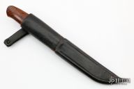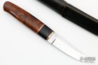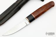 This knife by Marcus Doyle features a Michael West blade with .155" blade stock and .988" blade depth, hidden tang construction. The handle has a nickel silver guard, desert ironwood grip and a African Blackwood spacer. Comes with a black leather sheath. Excellent coniditon.