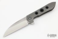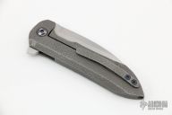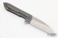 This Druid Flipper from Peter Rassenti features a tumble finished drop point wharncliffe style blade with false top edge and flipper. The handle is comprised of an integral titanium frame that has been textured and has zironium inlays and pivot collars, "Prism Frame", tip up pocket clip, lanyard hole in frame. Perfect blade seating, detent and lock up. Comes with nylon zippered case. Excellent condition.