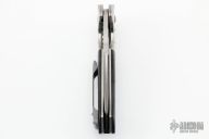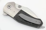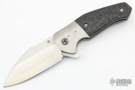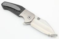 This Collaboration between Allen Elishewitz and Tashi Bharucha features a satin finished blade with a flipper. The handle has orange peel finished bolsters, marble carbon fiber scales, tumbled titanium liners, black G-10 backspacer and a tip up bead blasted stainless steel clip. Nice detent, lockup and blade seating. Comes with leather zippered case. Prototype. Excellent condition.