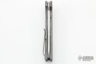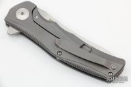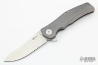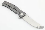 This Hills flipper from Reate features a stonewashed blade with notched thumbrest and flipper. The handle has a milled titanium frame with a bead blasted tip up clip. Nice detent, lockup and blade seating. Comes with nylon zippered case. Excellent condition.