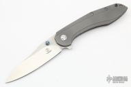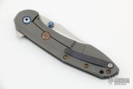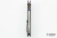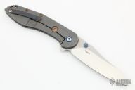 This Tolk Mid-tech by Brad Southard features a stonewashed finished blade with satin grinds, notched thumbrest and flipper. The handle has a custom stonewash finished titanium frame with matching tip up clip, anodized titanium barrel spacers, lockbar stabilizer and pivot collar. Has some light scuffs, otherwise excellent condition.  Comes with original box.