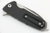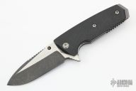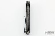 This Tank flipper by Allen Elishewitz features a two-tone finished blade with notched thumbrest and flipper. The handle has carbon fiber scales, textured titanium liners, and a stainless steel tip up clip, and a bead blasted stainless steel backspacer. Smooth flipper opening that requires no wrist action. Nice blade seating, detent, and lockup. Excellent work. Comes with a zippered case. Excellent condition.