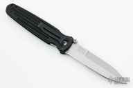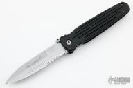 This Applegate Fairbairn Combat Folder by Gerber has a bead blasted stainless steel partially serrated spear point blade with dual thumb studs and false top edge. Handle is black contoured polymer with single stainless steel liner and lanyard hole. Excellent condition. Comes with original sheath.