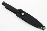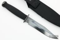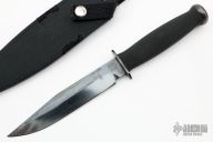 This is an extremely rare Recon Government, one of the few gun-blued SOGs made. It features a clip point blade with .155" blade stock and 1.108" blade depth, hidden tang construction. The handle has a blued steel guard and butt with a rubber grip. Comes with a black nylon sheath. Has a couple very light scratches, otherwise excellent condition.