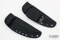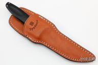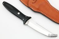 "It is only natural that Spyderco follow-up Bob Lum's folding tanto with a fixed blade, and a very classy one at that. It has a Hamaguri (appleseed) grind at the tip for added strength and the swedge on the spine lessens the overall weight. The blade has a tapered Tang, running the full length of the handle, adding overall strength. The expanded hand guard, where the blade and handle meet, makes it comfortable while gripping. Blade is hollow ground." The FB03 is a discontinued model no longer available from Spyderco. Includes original brown leather sheath and 2 custom kydex sheaths. Has a few light scratches, has been resharpened, otherwise good condition.