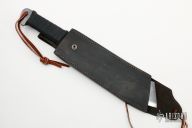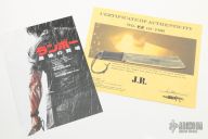 This is an original handmade limited edition copy of the knife designed and made by Gil Hibben and used by Sylvester Stallone in the 2008 movie "Rambo". The knife features a flat ground blade with hammered flats, .282" Blade Stock.  2.625" Blade Depth. The handle is wrapped with black tape over paracord, extended tang with lanyard hole. Numbered 44 of 100 and signed on blade spine and sheath. Includes a brown leather sheath, padded zippered case, COA and Movie Poster. These are not easy to find, don't let this one slip away.