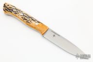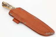 This Aurora LT by Bark River features a satin finished spear point blade, .145" blade stock and .980" blade depth, full tang construction. The handle has antique stag bone scales with lanyard tube. Comes with a brown leather sheath and original box. "1st Production Run" on blade. Excellent condition.