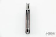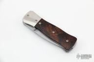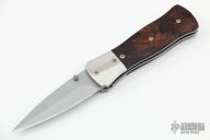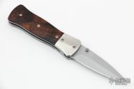 This linerlock by Dennis Greenbaum features a bead blasted spear point blade with dual thumbstuds and a false top edge. The handle has nickel silver bolsters, desert ironwood scales, fileworked stainless steel liners, stainless steel backspacer. Nice detent, lockup and blade seating. Comes with a zippered case. Signed and dated 2002 inside backspacer. Has some light scratches, otherwise good condition.