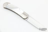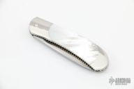 This Palm Release Auto by Ken Steigerwalt features a mirror polished blade. The handle has nickel silver bolsters, front and rear, mother of pearl scales, fileworked nickel silver liners, fileworked stainless steel backspacer. Nice action, lockup and blade seating. Has a few light scratches, otherwise excellent condition. Comes with a zippered case.