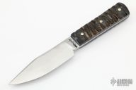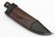 This knife by Master Smith Jay Hendrickson features a satin finished blade with false top edge and visible temper line, .183" blade stock and 1.171" blade depth, full tapered tang construction. The handle has kudu horn scales. Comes with a brown leather sheath with reptile skin inlay. Excellent condition. Sheath stamped 1996 and L6.