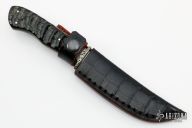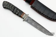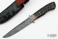 This knife by Santino Ballestra features a Damascus blade with false top edge, .183" blade stock and .952" blade depth, hidden/frame tang construction. The handle has an nickel silver guard that has been engraved by Panteghini, kudu horn scales with brass liners and black canvas micarta frame, black/brass/wood spacers. Comes with a leather sheath with black alligator skin overlay. Excellent condition.